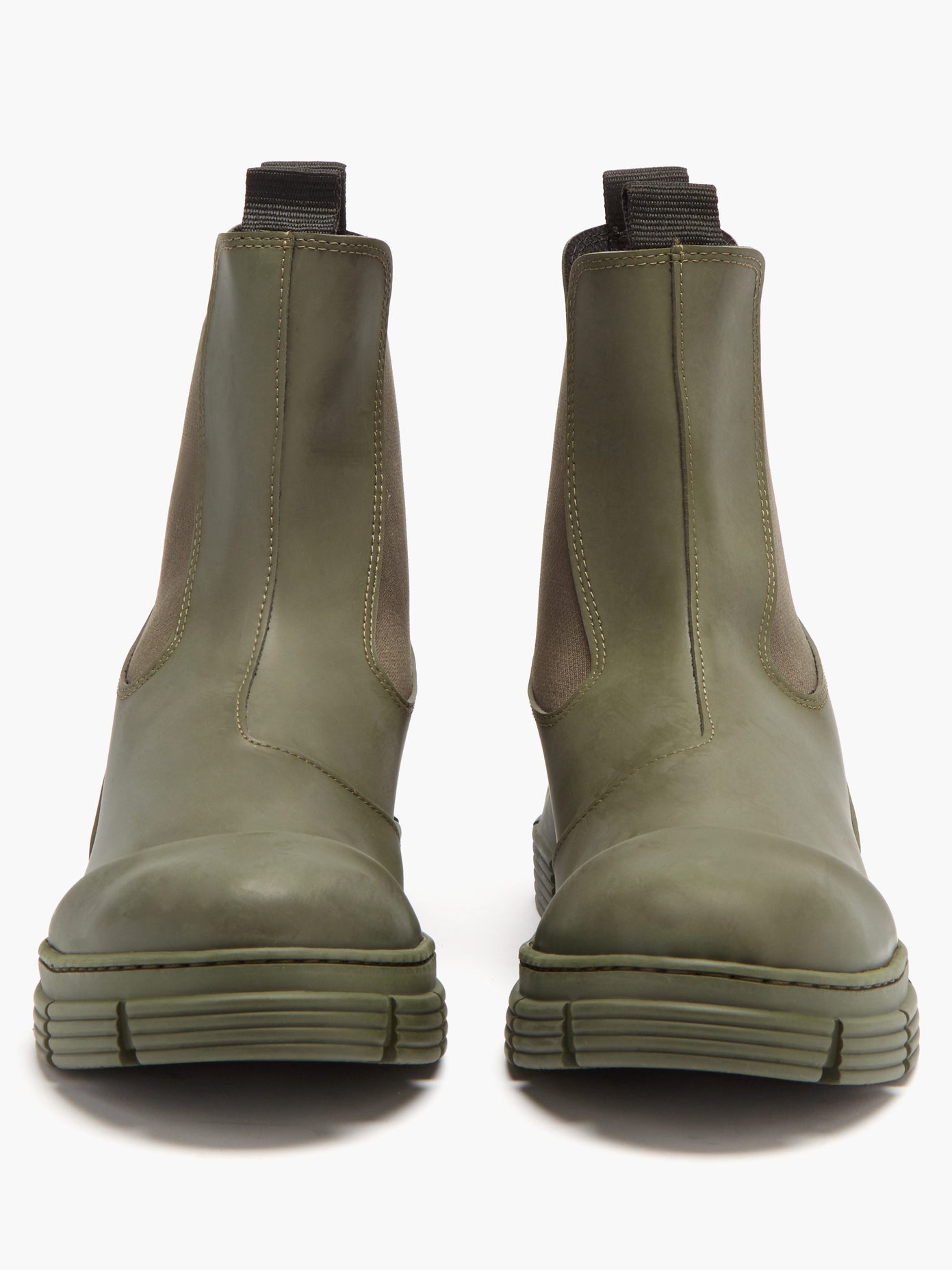 Part of ganni s pre fall 20 collection these army green chelsea boots are made from recycled rubber.